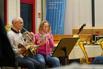 In humorvollen Antworten auf die Fragen von Michael Makiolla legen die beiden Hornist*innen ihren Weg zur NPW dar. Sietske van Wieren, die aus einem kleinen Dorf im Norden der Niederlande stammt, erzählte, dass sie schon immer Horn spielen wollte, weil ihr der Klang des Instruments gefiel. Erst als sie etwa zehn Jahre alt war, konnte ihr das Blasorchester ihres Dorfes ein Horn leihen, berichtete sie. "Ich habe in Groningen und Hamburg studiert", fährt sie fort, "und dann einige Praktika gemacht, zum Beispiel in Göttingen". "Hier bei der NPW ist es Ihre erste feste Stelle, die Sie bekommen haben, warum sind Sie geblieben?", fragte Herr Makiolla. "Die Stimmung unter den Musiker*innen ist gut, also warum sollte man gehen, wenn man sich wohl fühlt?", antwortete sie lächelnd.