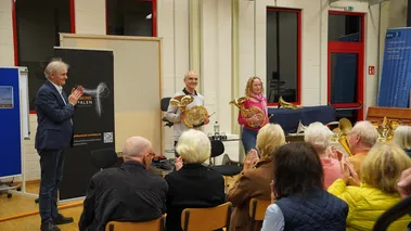 Von der Begeisterung vom Klang des Horns bis zum Beruf Musiker*in erfuhren rund 50 Mitglieder des Vereins der Freunde und Förderer der Neuen Philharmonie Westfalen Mitte November im Recklinghäuser Depot. Das Orchester hatte gemeinsam mit dem Förderverein zum zweiten „Meet & Greet“ der neuen Saison eingeladen. Zu Gast waren die NPW-Hornist*innen Siestke van Wieren und Bernd Eiteneuer, die den Zuhörenden neben Geschichten aus ihrem Leben reichlich Musik mitbrachten. Gemeinsam spielten sich die beiden Hornist*innen quer durchs Hornrepertoire – von Hans-Jürg Sommer auf dem Alphorn über Ausschnitte aus Bachs Brandenburgischen Konzerten bis hin zur 7. Sinfonie von Bruckner auf Bachhörnern und Wagnertuba, erlebte das Publikum alle Facetten und Klänge des Horns.