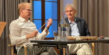 Wie es sich für Orchestermitglieder gehört, kam auch die Musik nicht zu kurz: Nikolas Mareske und GMD Rasmus Baumann brillierten u.a. im Duett mit Steve Reichs „Clapping Music“, während Walter Gödde einen Klassiker des Cello-Repertoires, den „Schwan“ aus „Karneval der Tiere“ – ebenfalls begleitet von GMD Baumann am Klavier, zum Besten gab.