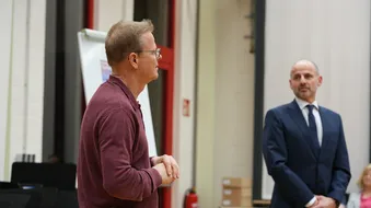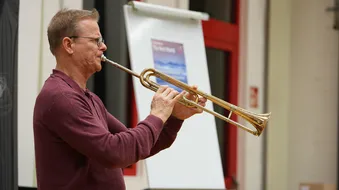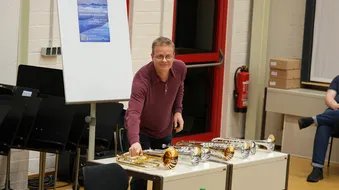 Die Präsentation der Instrumente war das Highlight für die etwa 70 anwesenden Fördervereinsmitglieder. Manfred Hof erklärte erst einmal, wie eine Trompete überhaupt einen Ton erzeugt: „Und dann kommt ein Ton raus…hoffentlich“, spaßt der Trompeter. Jedes seiner Instrumente (B-Trompete, C-Trompete, Naturtrompete, Piccolotrompete, Kornett, Flügelhorn und die beeindruckende Aida-Trompete) wurde von Hof erläutert und dann kurz angespielt. Dafür wählte er eine unterhaltsame Mischung aus klassischen Fanfaren und modernen Melodien und das Publikum hatte seinen Spaß.